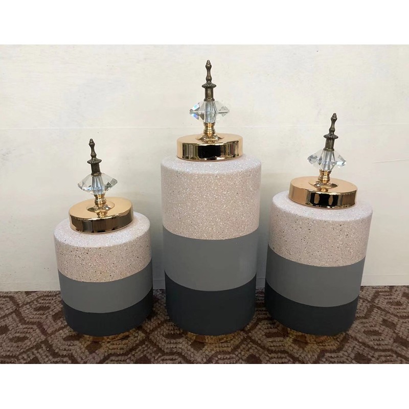 Κεραμικό Τζαρ Στρόγγυλο Ασημί/Ζαχαρί/Γκρί Με Μεταλλικό Καπάκι Με Διακοσμητική Φούντα 13.5x13.5x37εκ.