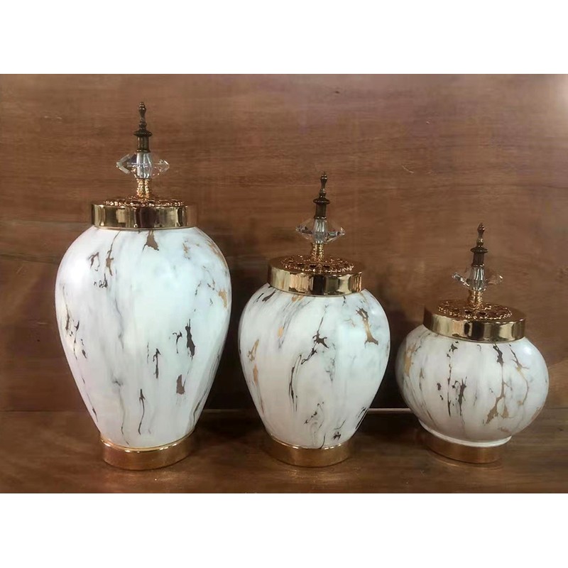 Κεραμικό Τζαρ Στρόγγυλο Λευκό/Χρυσό Με Μεταλλικό Καπάκι Με Διακοσμητική Φούντα 18x18x38εκ.